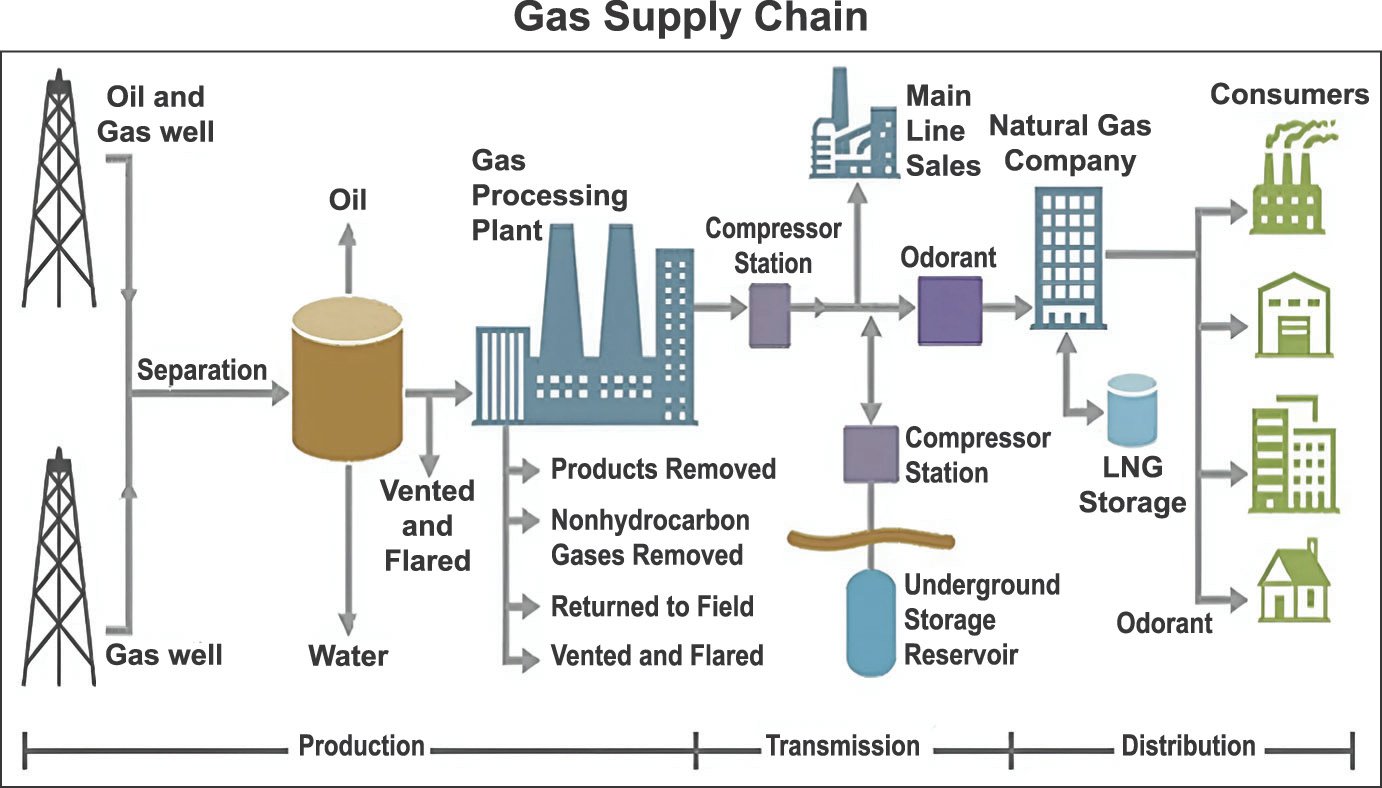 The gas supply chain has three distinct activities. Exploration and Production is termed upstream activity, transmission is the midstream activity and distribution, and supply is the downstream activity. A well-managed gas supply chain needs a well-coordinated and coherent gas supply chain. Custody of gas is transferred from E&P companies to transmission companies and from transmission companies to local distribution companies through custody transfer metering stations. The global supply chain manages custody transfer by SCADA and telemetry. Distribution systems use digital mapping and smart sensing. The old distribution pipelines are replaced. These days MDPE and HDPE pipes and fittings are used to reduce costs as these do not need anti-corrosion coating. Distribution networks also use smart sensing with fiber optics. However, E&P companies must ensure the delivery of pipeline-quality gas. At the delivery point, the online chromatograph should continuously monitor the gas composition and heating value, and the dew point tester should monitor the water dew point and hydrocarbon dew point. This writer visited the Alliance Pipeline in Calgary Alberta Canada, the Gasuine Transmission network in the Netherlands, British Gas Transco Transmission system in the UK.