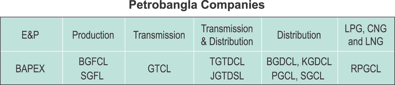 Bangladesh's gas supply chain has one exploration and production company, BAPEX, and two production companies – BGFCL and SGFL. In addition, two international oil companies, Chevron and Tullow, supply gas to the national gas grid under a production-sharing agreement with Petrobangla. RPGCL manages LNG import and supplies to the grid,