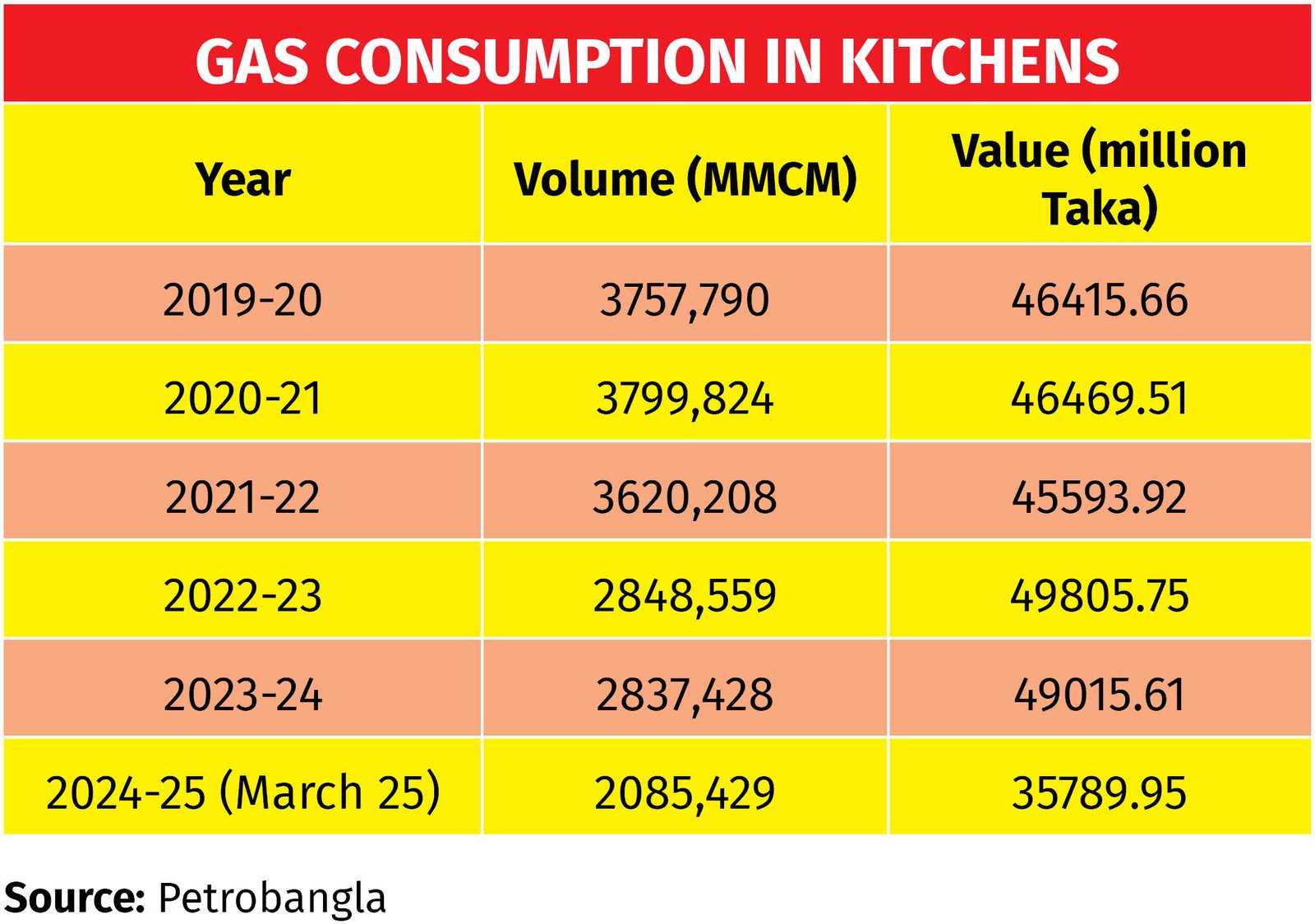 However, the rapid expansion of the CNG network significantly destabilized gas supply pressure by 2010. By then, the Bibiyana gas field was producing substantial volumes for the domestic market, yet Bangladesh was already facing gas shortages. The country was never truly “floating on gas.” The CNG sector alone was consuming about one-tenth of the total daily gas supply of roughly 2,000 million cubic feet per day (mmcfd), while the domestic sector accounted for approximately 12.1% of total natural gas sales. Despite this, there was already a demand shortfall of 400–600 mmcfd.
