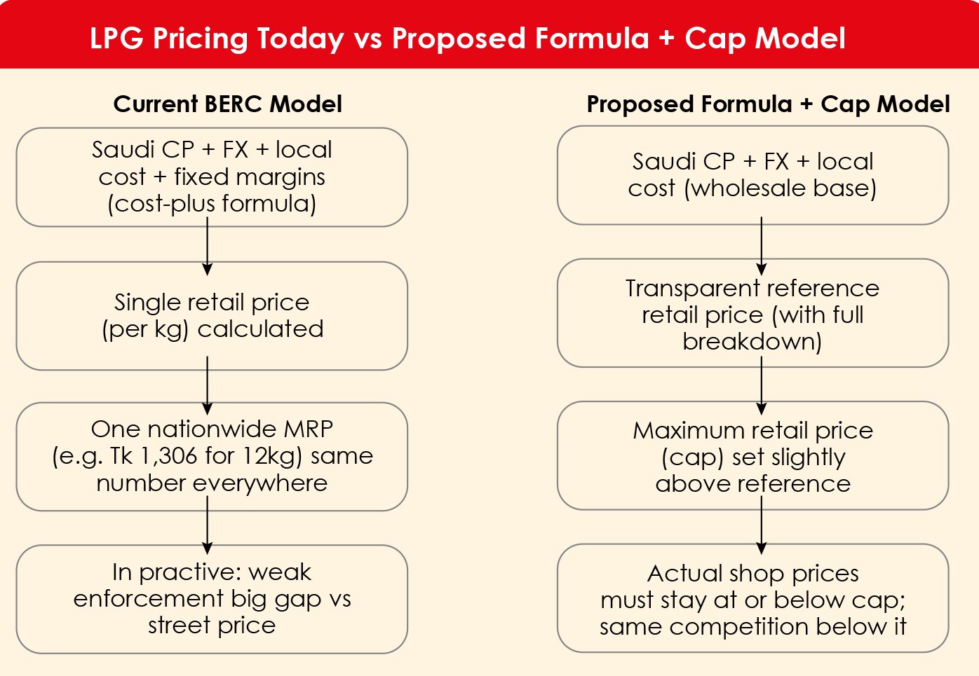 Before going further, one point must be clear. Nothing in this proposal suggests that retailers should ignore BERC’s existing LPG price orders, or that market forces should override the law. The recommendations here are aimed at BERC and the government themselves: they describe how the current regulatory framework could be reformed so that the official formula better reflects real costs, and the official price is actually enforceable in practice. In other words, this is a call for formal, transparent change in the rules, not for anyone to break the rules that exist today.