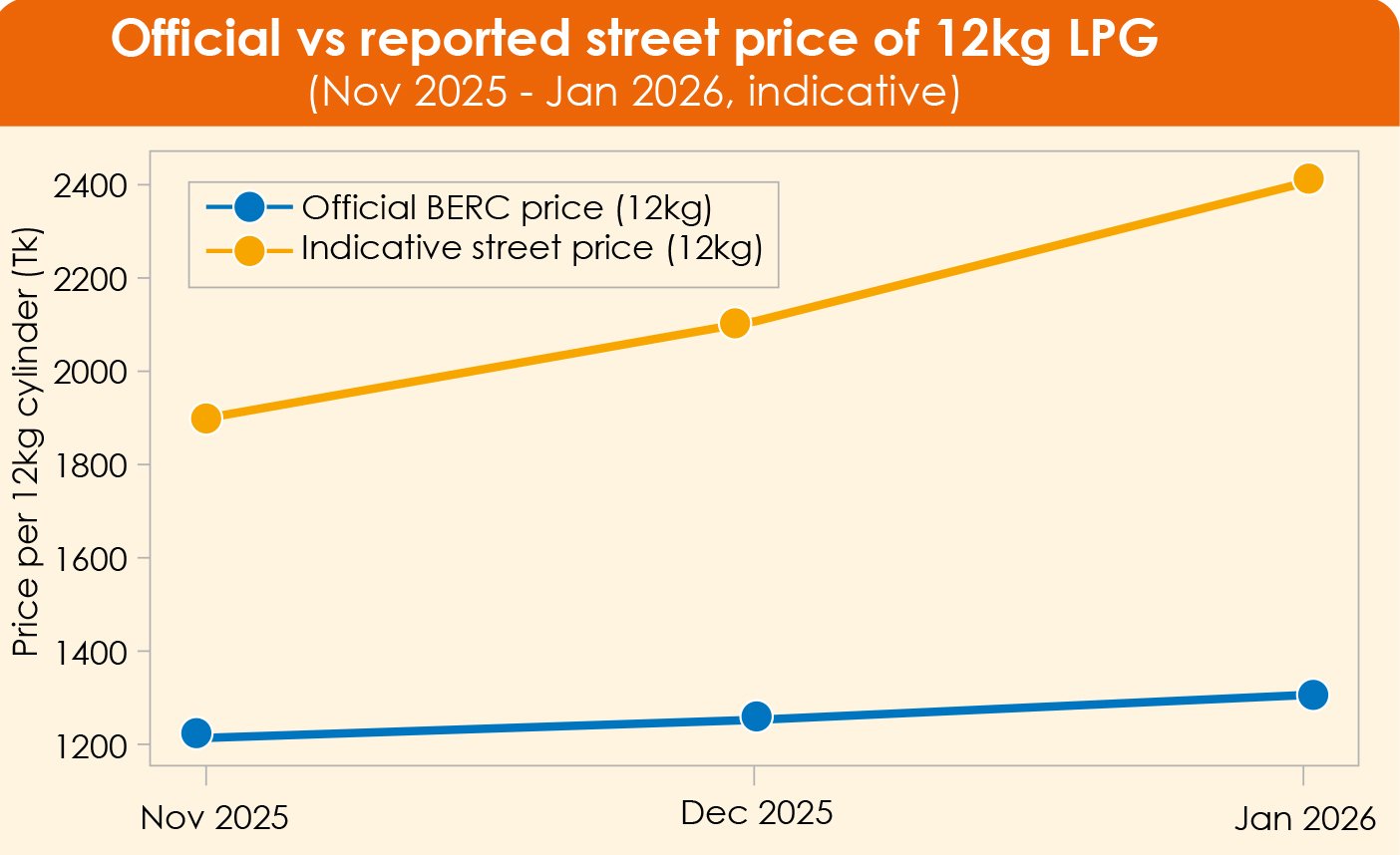 Since April 2021, BERC has been fixing LPG prices every month using a formula tied to the Saudi Aramco Contract Price (CP). The regulator adopts the international benchmark, adds freight, port, and handling charges, taxes, and standard margins for importers, distributors, and retailers, and publishes a per-kilo ceiling that translates into a set of maximum retail prices for different cylinder sizes. For January 2026, this calculation produced an official price of Tk 1,306 for a 12 kg cylinder, up from Tk 1,253 in December. In November, the same cylinder cost around Tk 1,215. Month to month, the pattern looks measured and technocratic: small adjustments in line with movements in global LPG prices and the exchange rate. But anyone who actually tried to buy a cylinder in late December or early January knows a different story. Across many urban neighbourhoods, consumers have reported paying Tk 2,000 to Tk 2,500 for a 12 kg cylinder, often after visiting multiple shops.
