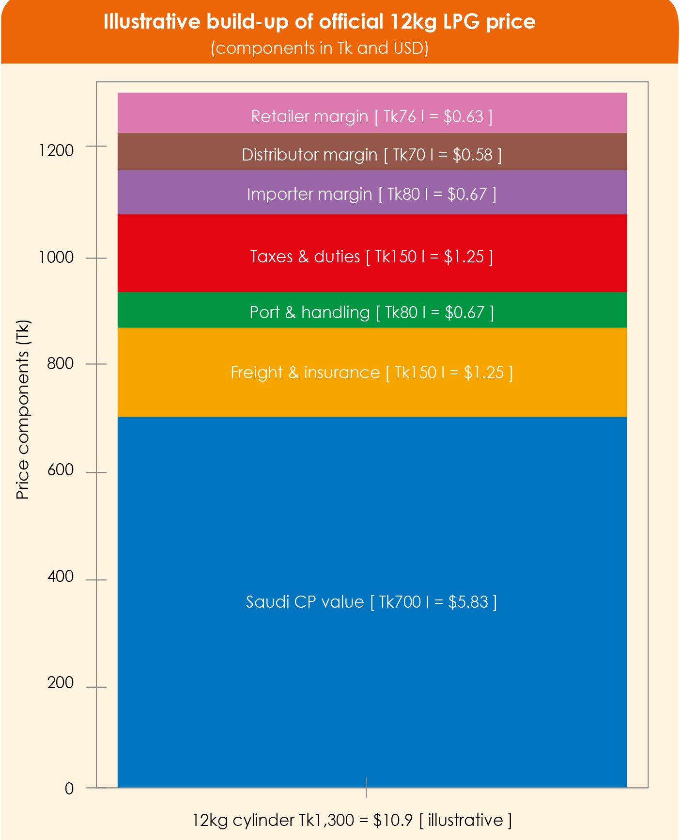 Figure 2:Illustrative build-up of the official 12 kg LPG price (Tk 1,306), showing each component in taka and approximate US dollars (assuming 1 USD ≈ 120 Tk). This kind of transparent breakdown would help clarify which part of the chain drives price changes and where reforms should focus.