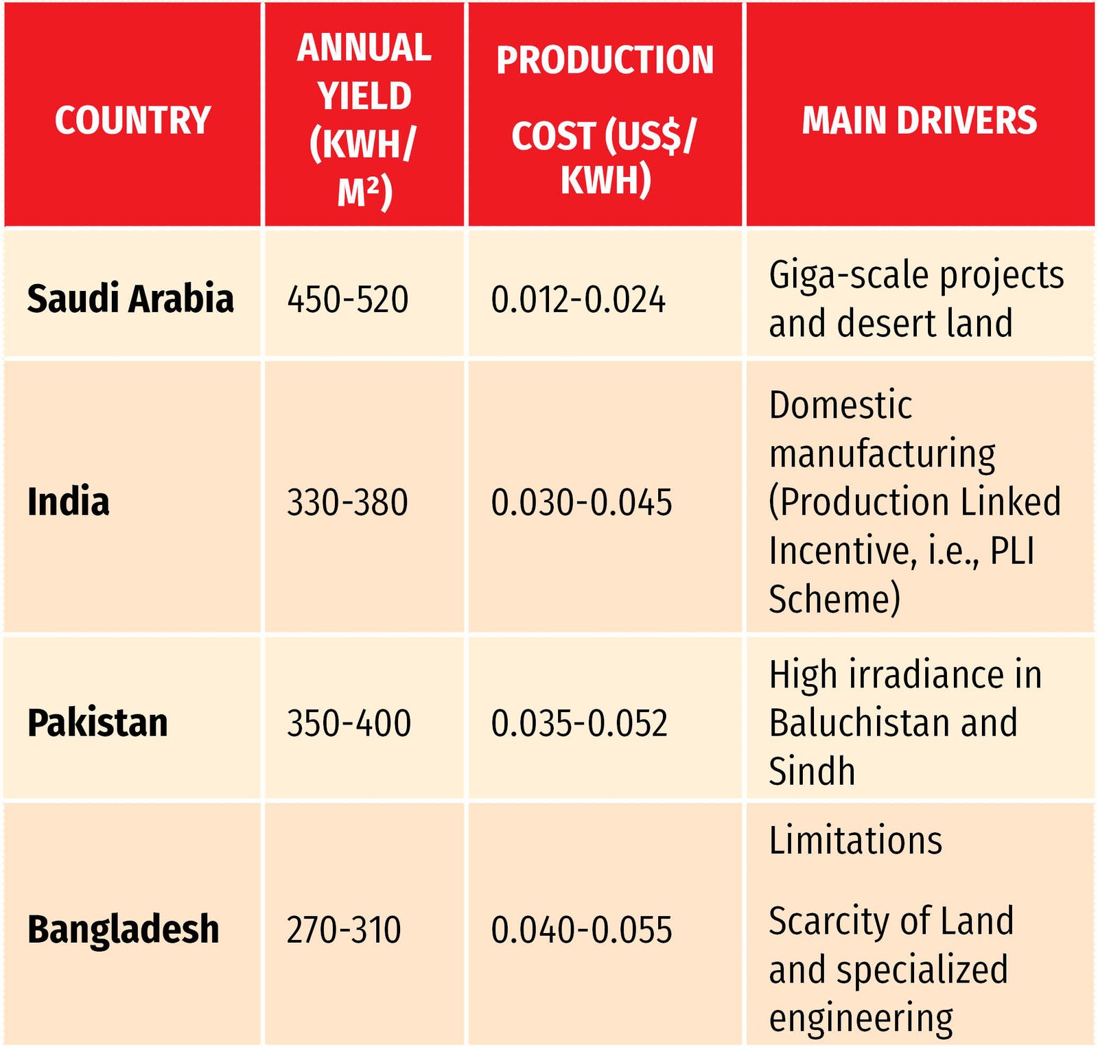 Saudi Arabia and Pakistan benefit from higher raw sunlight. They also face a ‘heat penalty’, where temperatures above 25°C decrease panel efficiency by 0.3-0.5 percent per degree. In contrast, Bangladesh’s lower yield is compounded by high cloud cover during monsoons and the high cost of specialized engineering required for marshlands and water bodies.