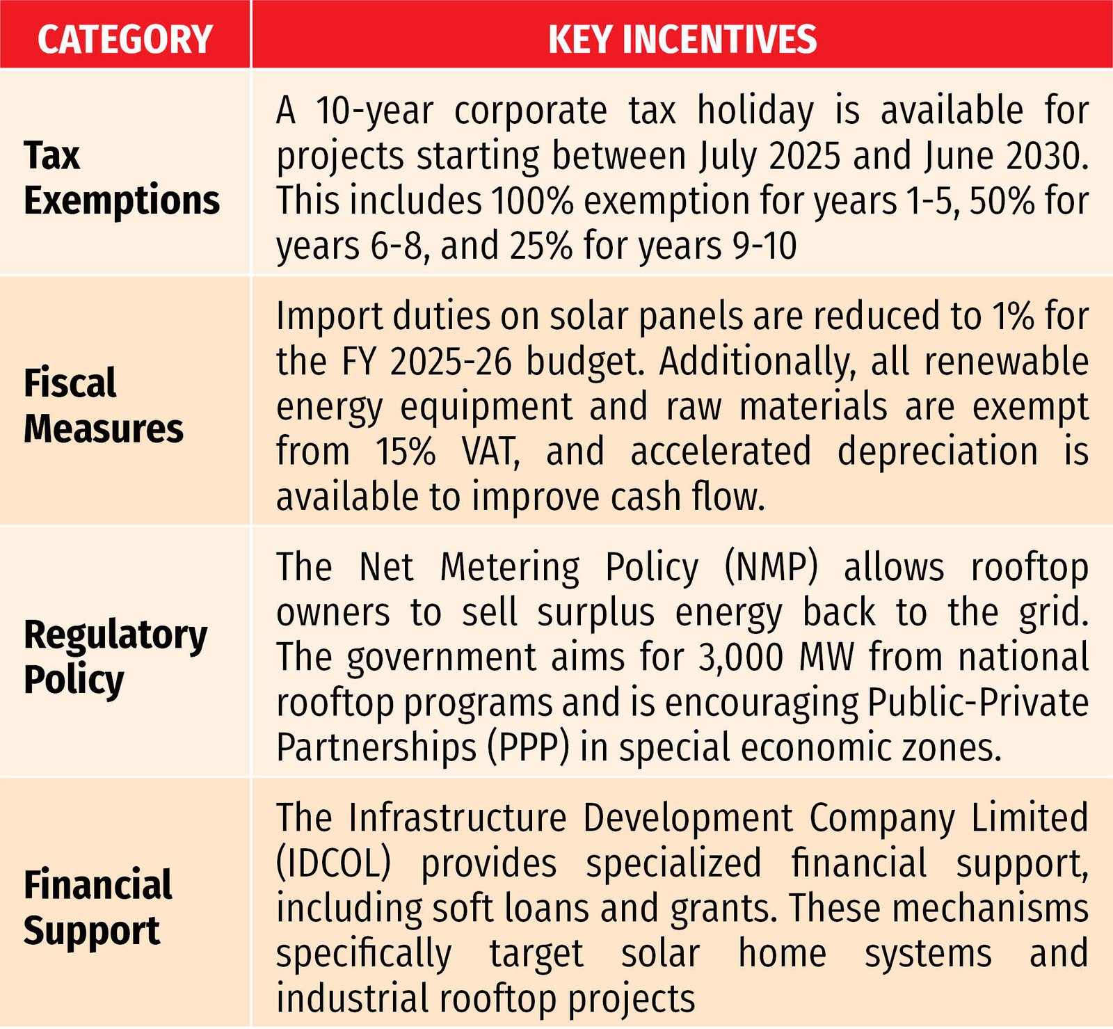 The Government is heavily incentivizing the solar energy sector through tax holidays, import duty exemptions on machinery, and competitive bidding for projects to promote local manufacturing and renewable adoption, as outlined below: