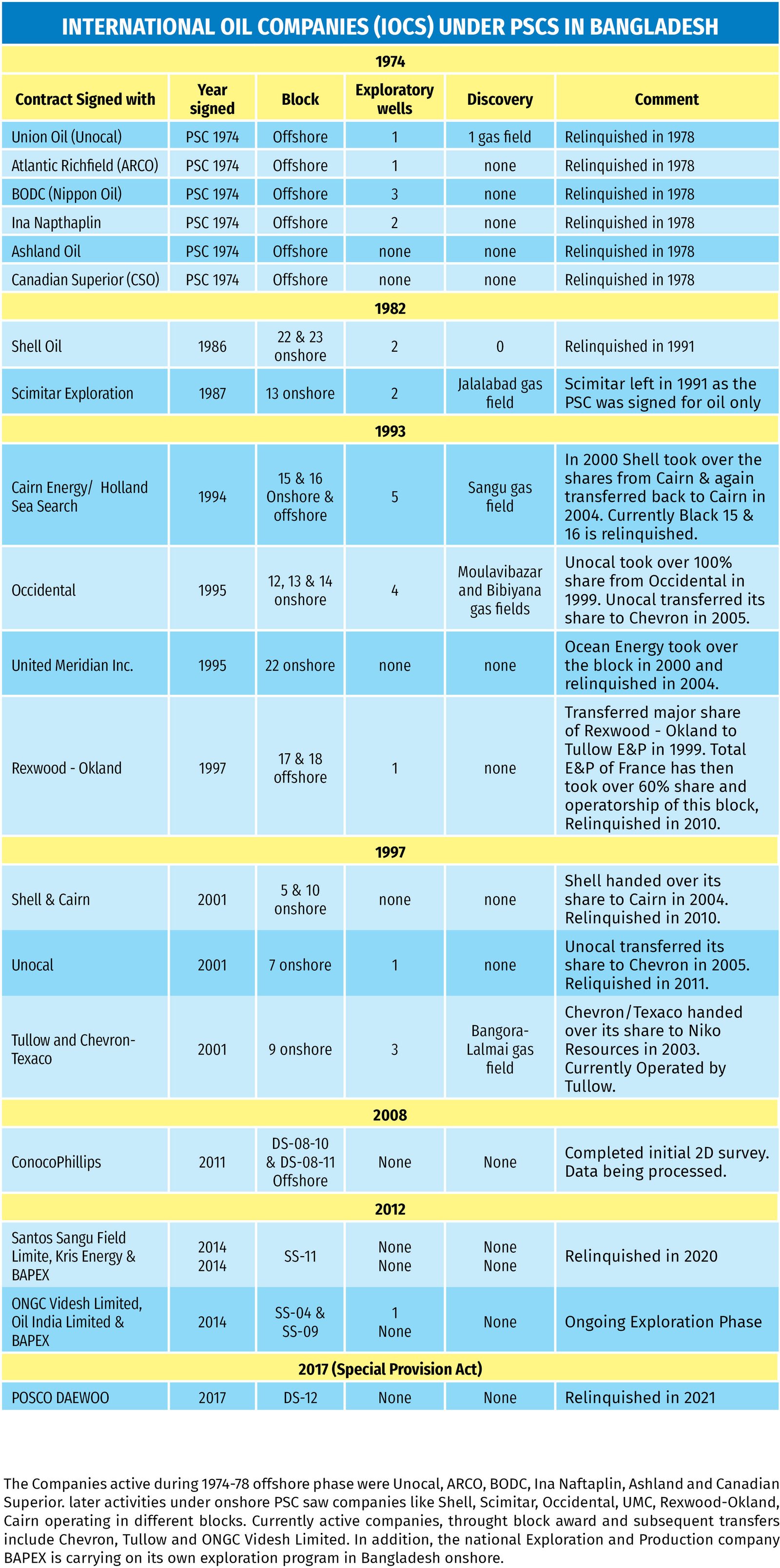 Based on interest and priority, PSCs were signed through negotiations. This became one of the most successful PSC initiatives in Bangladesh’s history, as it led to the discovery of the Sangu gas field offshore (now depleted). Onshore, the Jalalabad gas field was developed, while Occidental Petroleum and later Unocal Corporation discovered the Moulvibazar and Bibiyana gas fields. Together, these three fields have supplied more than 60% of the country’s total gas production to date.