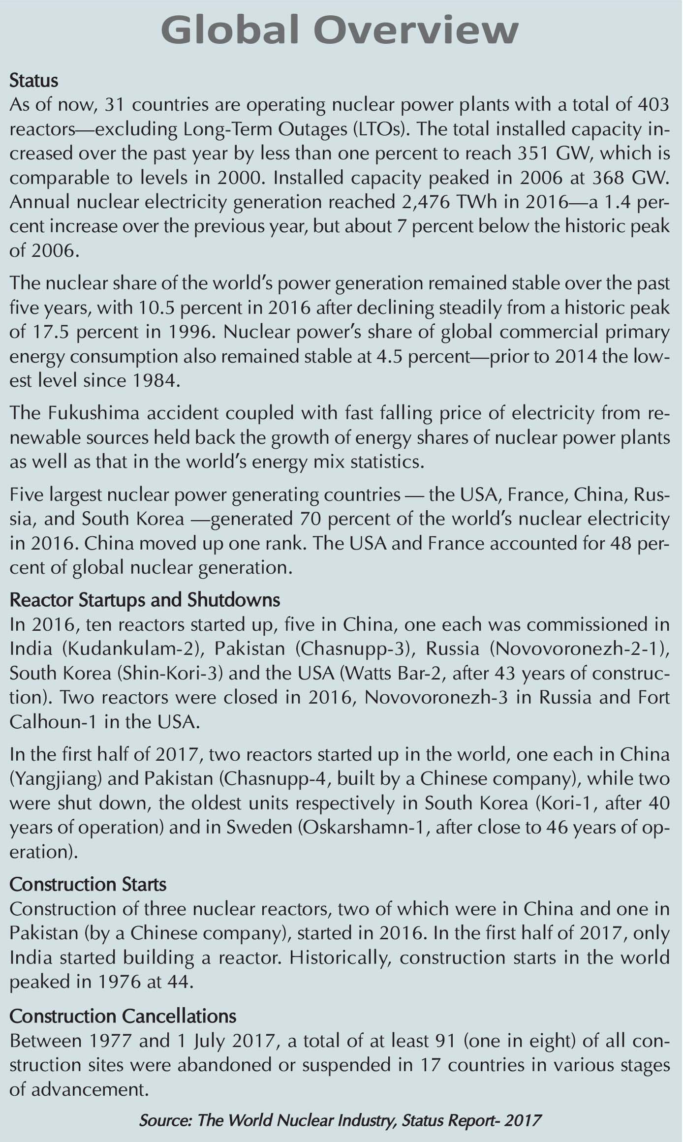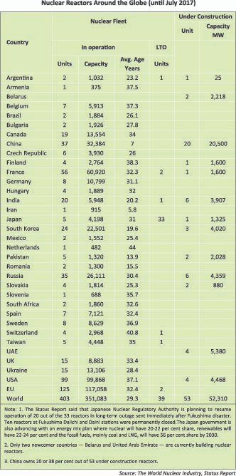 Each of the other five Asian countries, however, have the capacities oftwo to all of uranium mining, uranium ore’s conversion into oxide, uraniumenrichment, fuel fabrication, reprocessing of spent nuclear fuel and waste management facilities, according to the World Nuclear Association.The five Asian countries have developed its own manpower for operation and maintenance of approximately 130 nuclear power plants and developed linkage industries to supply spares and many other components of nuclear reactors.
