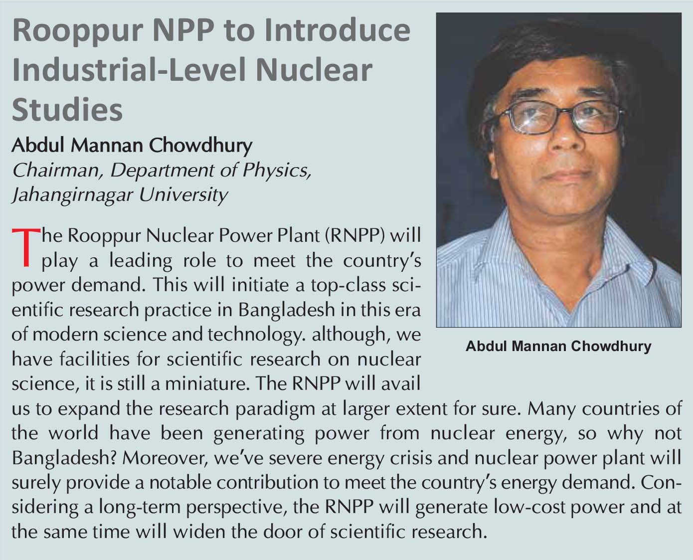 In the other part, only the University of Dhaka opened nuclear engineering department four years ago under its Engineering Dean with 25 seats each at the undergraduate level and post-graduate level. The new department has been limping since its inception with inadequate teachers and almost no laboratory facilities. An associate professor, an assistant professor and four lecturers with a supernumerary professor and a few guest lecturers from the BAEC and other DU departments are conducting the course curriculum. Only masters students get opportunity to have access to the research reactor at Savar. Among the other universities, Military Institute of Science and Technology opened nuclear engineering department three years ago with limited resources. Bangladesh University of Engineering and Technology is yet to launch its nuclear engineering department although it had announced it more than two years ago.