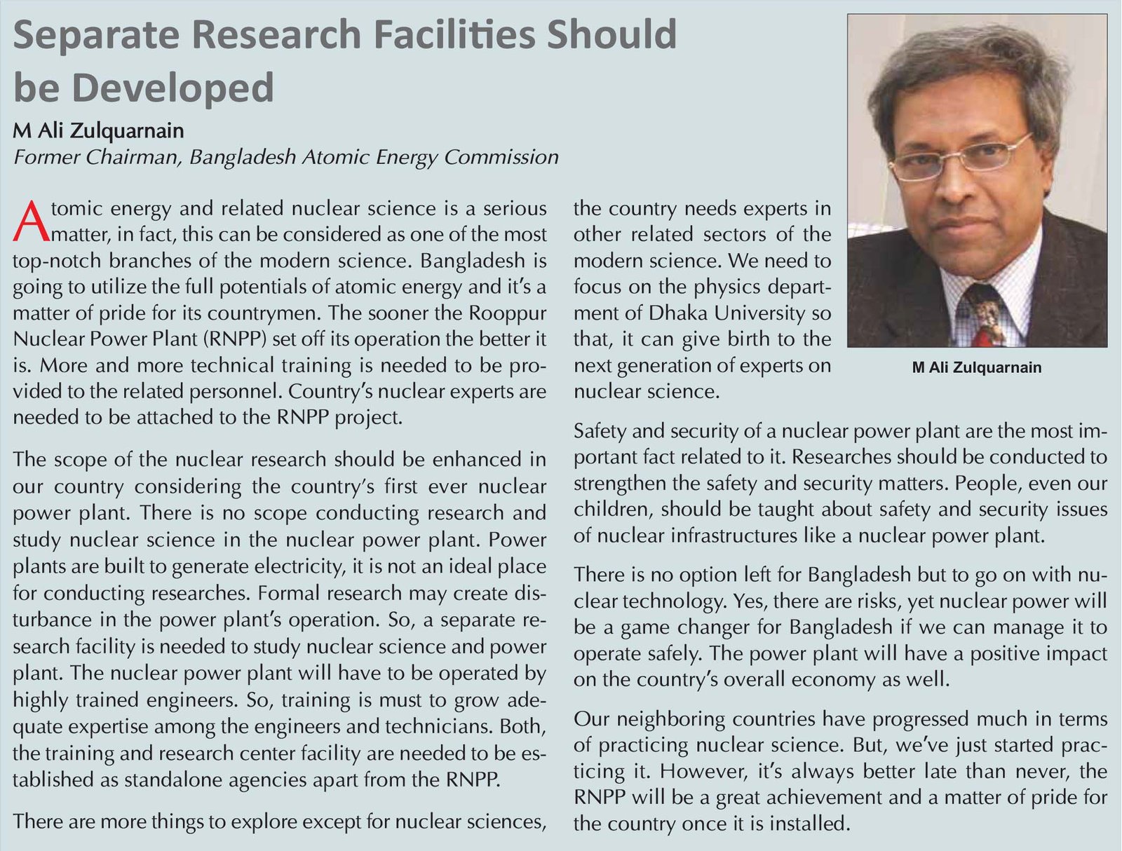 Since its inception in February 1973, the BAEC has so far developed some nuclear research facilities including Atomic Energy Research Establishment, Institute of Nuclear Science and Technology, Institute of Food and Radiation Biology, Centre for Research Reactor, Tissue Banking and Biomaterial Research Unit, Institute of Radiation and Polymer Technology, Nuclear Mineral Unit and Energy Institute. But the facilities are hardly capable of facilitating skilled manpower development for operation and maintenance of nuclear power plant as well as that for management and disposal of low-level radioactive wastes to be produced from the plant.