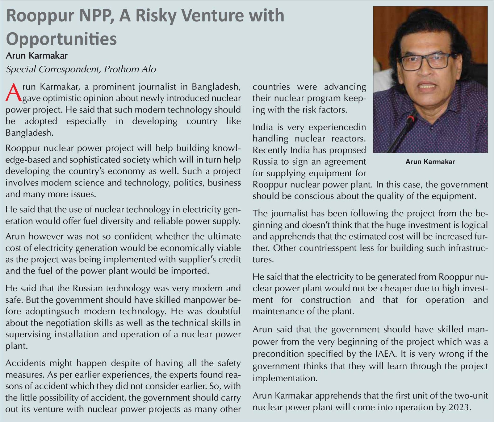 All the preparations are needed to be taken before commissioning of the power plant as they are made mandatory in the IAEA guidelines. And these preparations need investments of several billion US dollars. The government considers the investments as much needed in every area for their individual role in the economy. Critics, however, say that the government’s nuclear power program is premature as the country’s economy and infrastructure were not ready for it. They warned that all the investments and infrastructures might ­become a burden in terms of safety, security and economy.