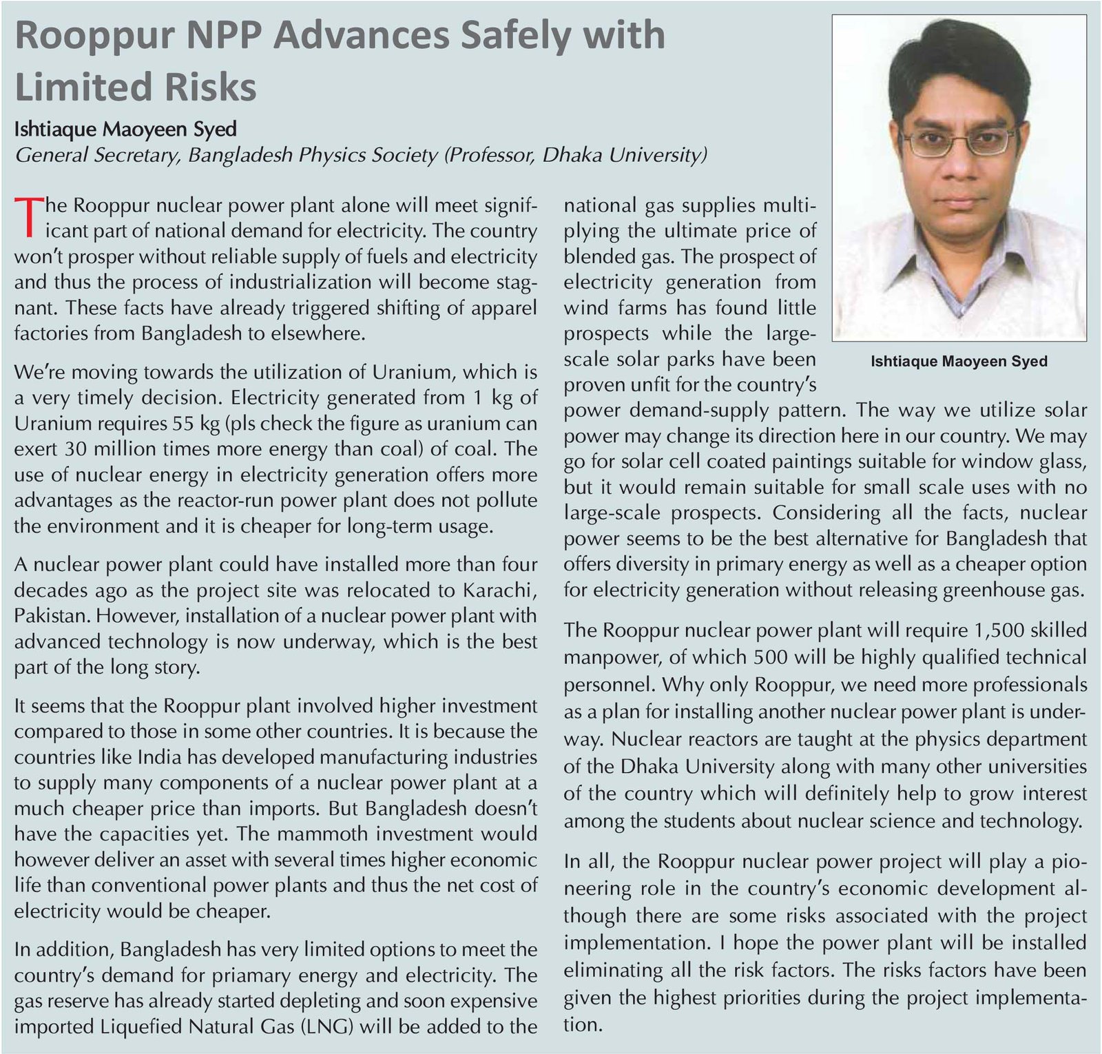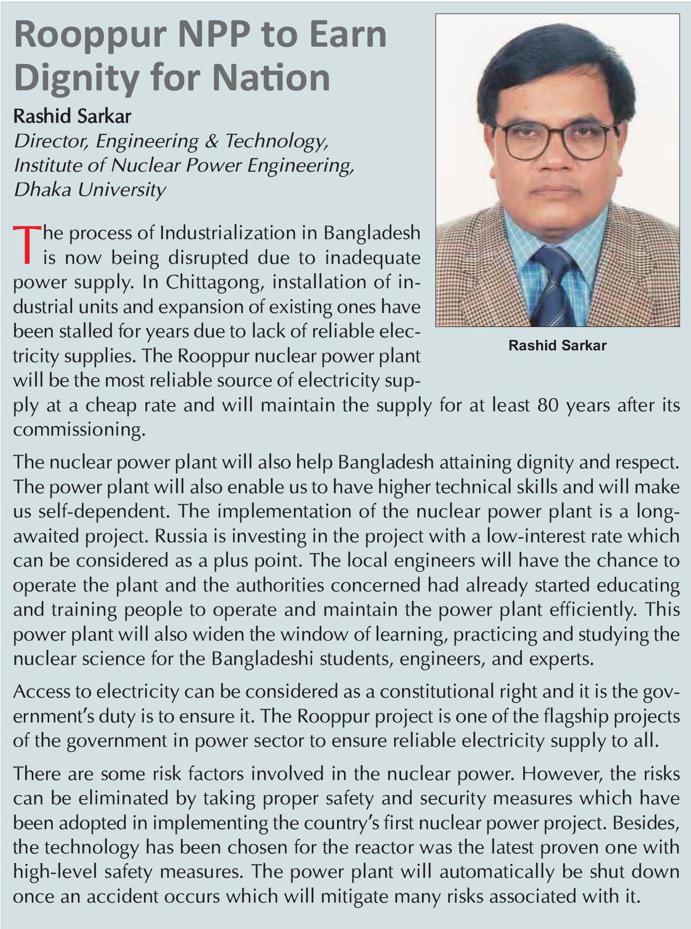 Bangladesh, however, has almost a clean track record of operating and maintaining foreign technology-based infrastructures like underground mines (a coal mine and a hard rock mine), the power plants run on fuel oils, gas, coal and hydro and so on. This might have been one of the indicators to have hopes that Bangladesh would be able to manage installation of safe infrastructures for its first nuclear power plant with Russia’s assistance and that to operate and maintain the facilities by its own manpower.