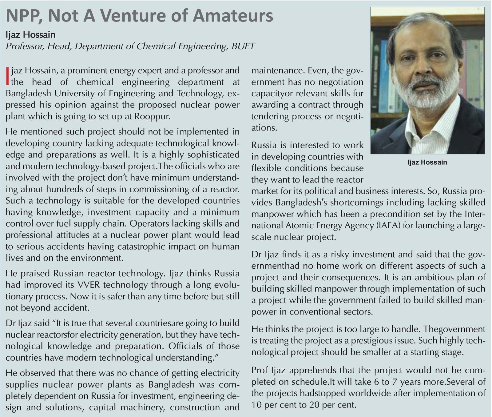 The BAEC depends on its foreign consultants for examining every piece of work done by Russian contractors before disbursing their payments. The BAERA is also solely dependent on foreign consultants for examining documents submitted by the BAEC and the contractors for obtaining different licenses and approvals like the licenses for site, nuclear reactor’s design, construction, commission of the plant and its operation, etc from it.