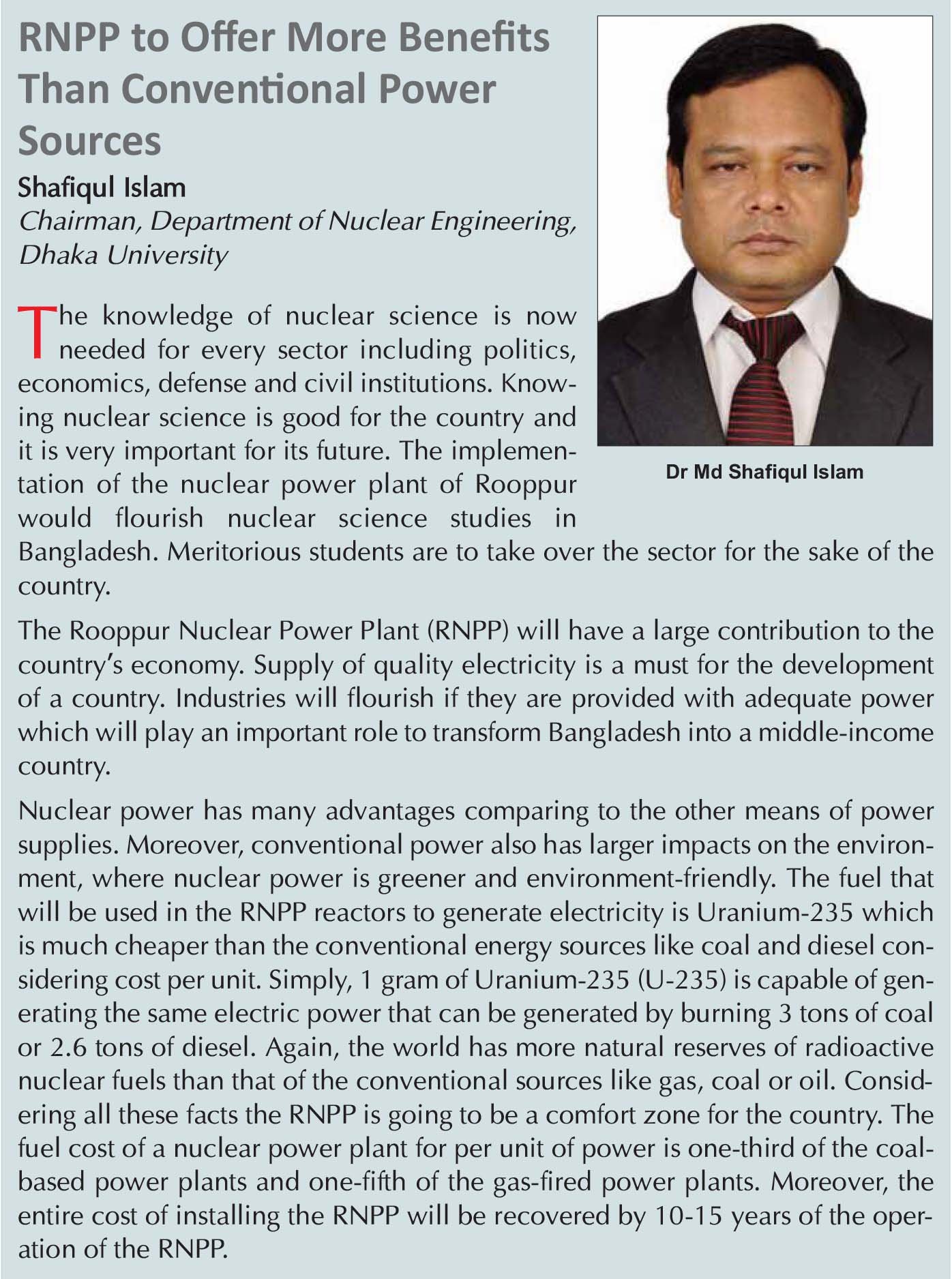 It is very unfortunate that the common people of Bangladesh have been away from knowing the advancement in nuclear technology. The common perception about nuclear technology in Bangladesh is mainly dominated by the destructive capacity of nuclear weapons, particularly experienced in Japan towards the end of the World War II, and nuclear explosion at a power plant in Chernobyl in 1986. The Fukushima nuclear disaster at a Japanese power station in 2011 was the last accident that solidified people’s fear about nuclear technology.