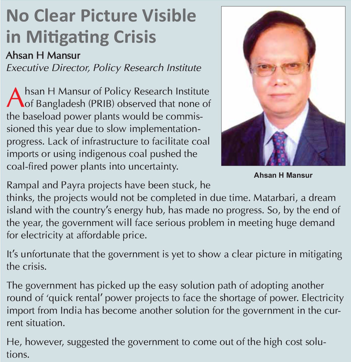 Energy experts are observing that the present contribution of liquid fuel of power generation capacity is 37%. During the last year, the liquid fuel contributed 22% of actual generation. The government has initiated actions for new liquid fuel-based power generation. By next year, the contribution would increase to over 50%. Liquid fuel will become major contributor next year. About 1,000 MMCFD of LNG may be available for energy generation by end-2018. This would increase gas based power generation. But the imported LNG being costlier than local gas would also increase the cost of generation.