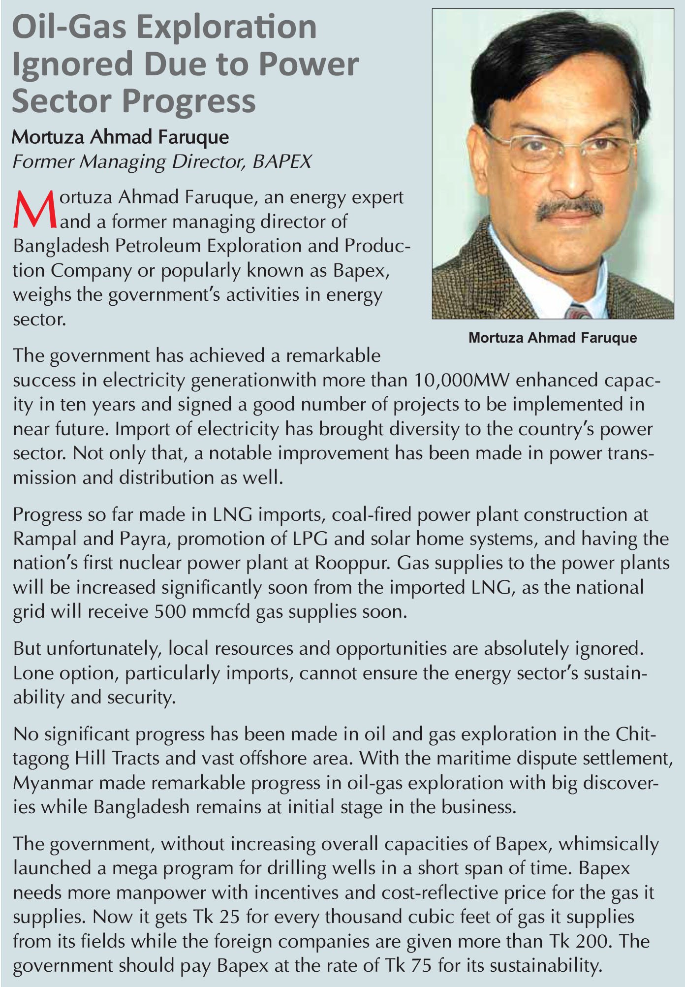 There were admirable achievements in short and medium term power generation initiatives over the first 5 years of the government, but the performance in energy sector was like darkness below the candle lamp. It was announced in 2010 that gas crisis would be confronted through importing LNG by using floating LNG terminal. But nothing could be done over the entire term of the government. It is expected that in the last year of the second consecutive term, the first FSRU of 500 MMCFD capacity may come into operation in March-April, 2018. Few initiatives were taken to increase gas production at onshore and offshore during this period. Some marginal gas fields could be discovered by BAPEX in the onshore. But these could not make notable progress. But further development of earlier gas fields increased production from 1,700 MMCFD to 2,700 MMCFD. But deficits further widened. The ministry informed that the entire discovered gas reserve would deplete by 2031 if no large gas fields are discovered and brought into production in the mean time.