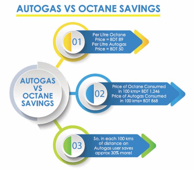 An LPG-powered engine takes very little time to heat up, whereas engines running on diesel or octane take longer period of time to warm up. High octane (+100) LPG has far less pre-ignition (knocking), which results in far better engine performance. Moreover, LPG is more cost-effective than octane, both in terms of price and mileage. The price per liter octane is BDT 89; wherein autogas’ price stands at BDT 50 per liter. The total amount of cost calculated in 100kms for an engine running on octane is BDT 1246. On the other hand, the same distance would require only BDT868 if you are running your vehicle on autogas. It means in every 100kms of distance; an autogas-run vehicle can save approximately 30% more in comparison to an octane user.