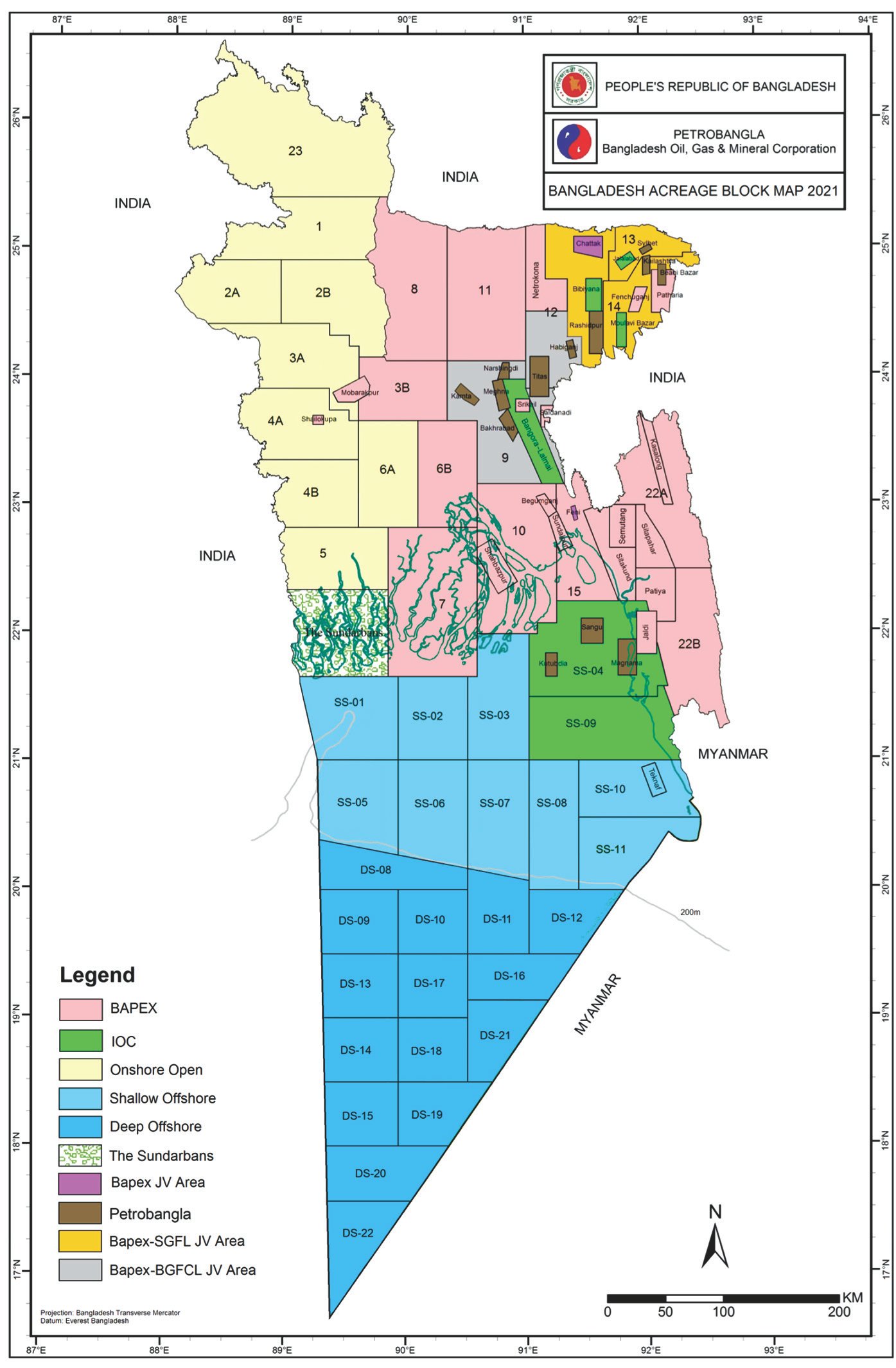 Two PSCs were signed with ONGC Videsh Limited (OVL Limited), Oil India Limited, and BAPEX for two blocks SS4 and SS9 on 17 February 2014 following the successful resolution of the maritime boundary dispute with Myanmar. The operators carried out 5081 line-kilometer 2D seismic surveys and upon an interpretation of data selected 2 drilling locations at SS4 and SS09. From September 2021, they started drilling at Kanchon 1. The work was completed in March 2022. But the exploration did not yield any positive dividend even after drilling up to 4228 meters in depth as per the plan. Exploratory wells will be drilled at Titli 1 at SS04 and Moitri 01 at SS09 by February 2023.