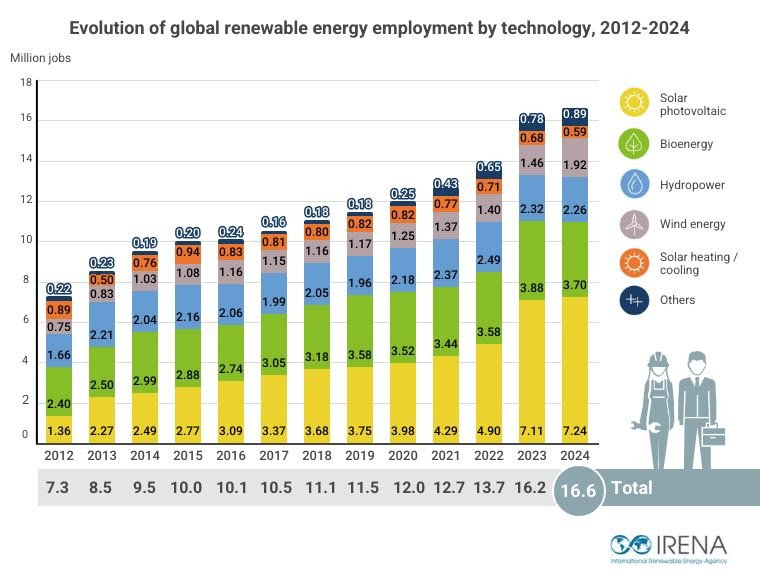 In terms of employment by technology, solar photovoltaics (PV) retains the lead, owing to the continued rapid expansion of installations and panel manufacturing plants. The industry employed 7.3 million people in 2024. Asian countries hosted 75% of the world’s PV jobs with China garnering the bulk of the employment at 4.2 million.