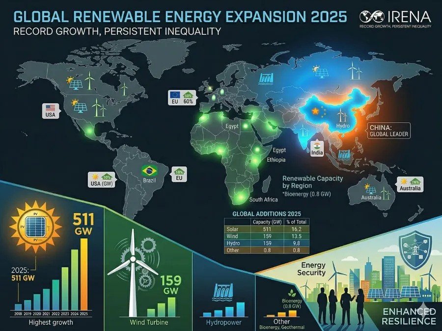 Globally, renewable capacity continues to expand rapidly, with 692 GW added in 2025, while costs have fallen sharply—making over 85% of new renewable power cheaper than fossil fuel alternatives.